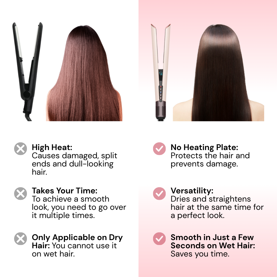 No need for multiple devices, Sohoohair dries and straightens your hair simultaneously, whether it's wet or dry. Quick, easy, and flawless styling, without compromise.